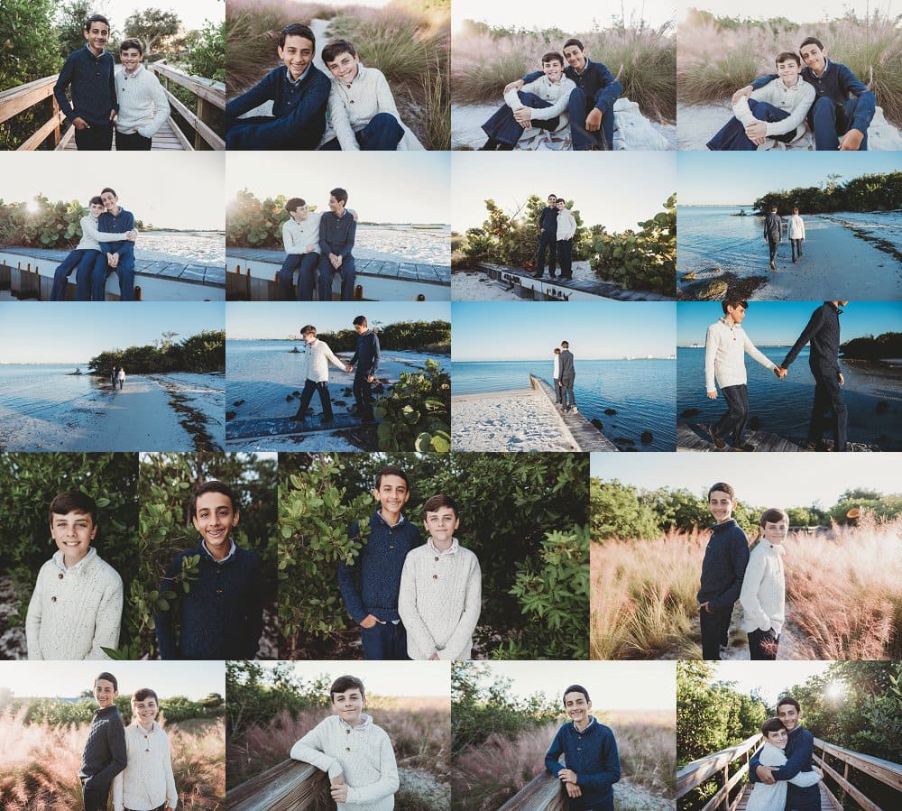 From baseball to taking their pictures for years- I have loved watching these boys grow into young men. Mom said Joshua and Mikey enjoy playing video games… hhmmm sounds like my boys. But they were off their video games for a while this day at the beach for their Tampa siblings beach photos. Mom chose Cypress Point Park for their session because it’s a classic Florida location (even though the weather surprised us and it ended up being very cold this morning!). Due to the weather change, mom had to scramble to buy different outfits. She did a great job last minute finding clothes they were comfortable in and looked great together (last minute Target find!).